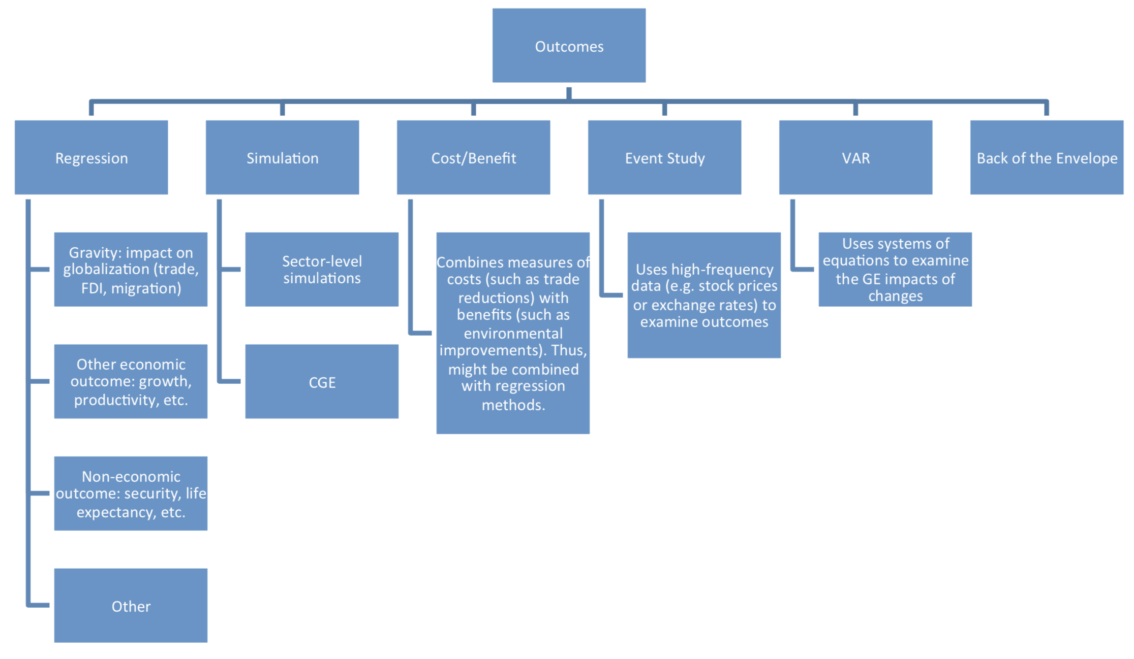 The second key descriptor of a particular study is its perspective. Here, we use two categories: retrospective and predictive. A retrospective study is one that considers past events. Some methods of analysis, such as regressions, are by their nature retrospective because they require data on events and variable realizations that have already happened in order to carry out the method. Others, such as CGE modelling, are usually predictive as they seek to provide estimates of potential outcomes for events that have yet to occur, such as a proposed reduction in NTMs. Note that predictive studies include both simulations and out-of-sample predictions.